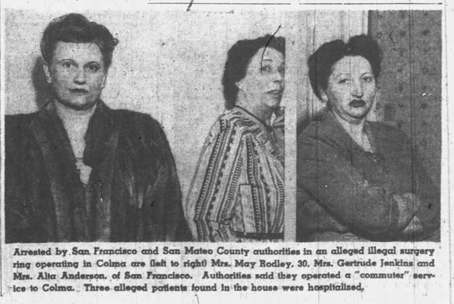 On a table near Gertrude’s dead body, the motel clerk found a bottle of heart stimulant tablets with the note in case of illness, notify Bert Haley. Haley, a local bar owner and Gertrude’s son-in-law, was her co-defendant in an abortion case for which she was set to stand trial in two days. Her daughter Della Haley and as many as five others were under suspicion for having formed a major illegal surgery ring. The charge against the group stemmed from an abortion received by a young divorcee at a Los Gatos home. The district attorney reported that they’d performed as many as 800 more abortions for patients from five western states over two years. Another authority named their caseload as half-a-dozen operations a week. Headquartered in the Alum Rock foothills district, they’d allegedly made profits totaling $320,000, or $3M in 2019 dollars.